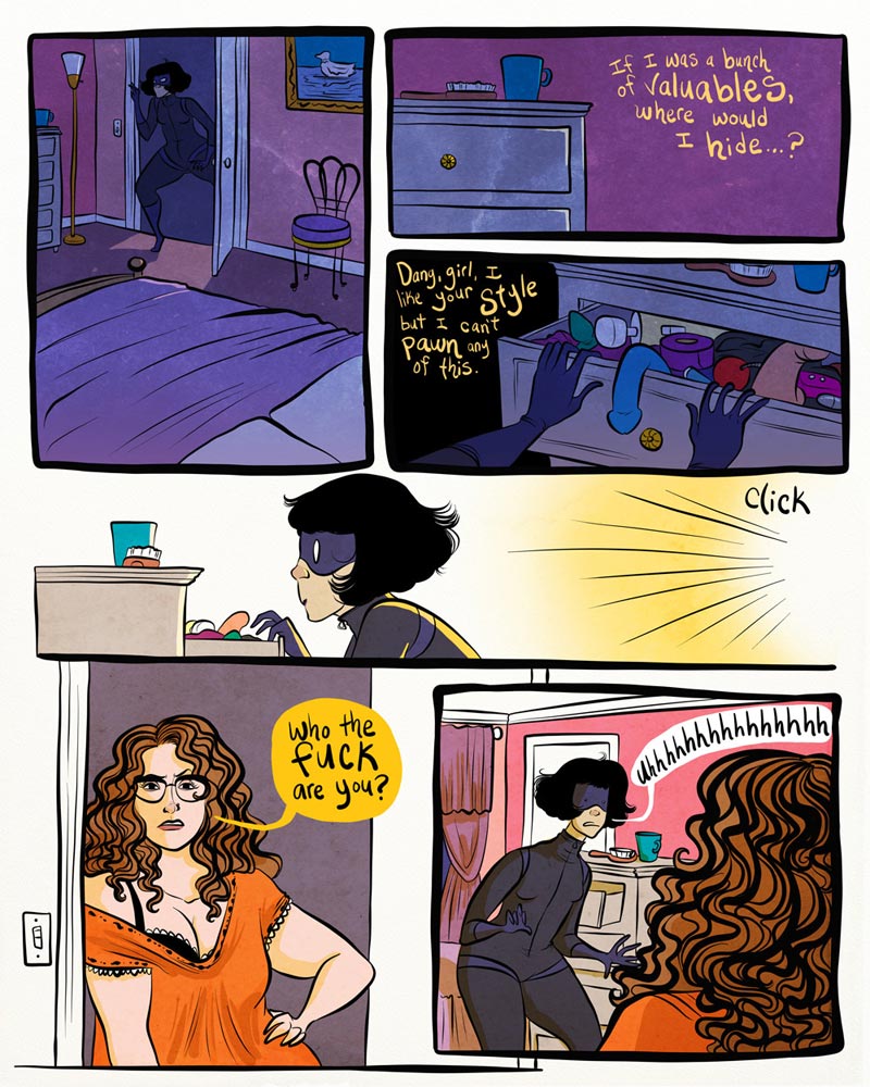 Jenny is a robber in a black catsuit. Talula is a lady with a very nice house and a reason she doesn't want the cops involved when she catches her sneaky visitor.