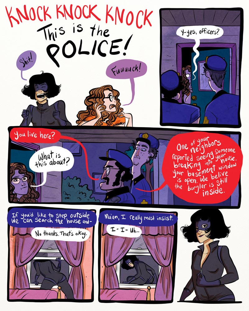 Jenny is a robber in a black catsuit. Talula is a lady with a very nice house and a reason she doesn't want the cops involved when she catches her sneaky visitor.